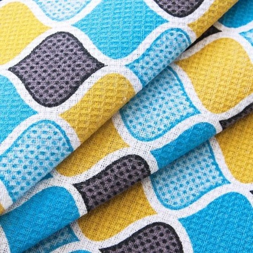 - Окрашивание. Ткань полотенечная вафельная отбеленная является самым лучшим вариантом, она смотрится красиво, практична и впишется в любое помещение. Если хочется чего-то поярче, то нужно брать гладкоокрашеные или набивные ткани.