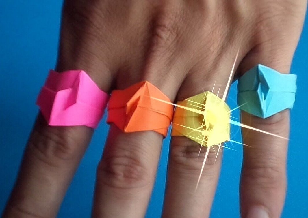 Сделать кольцо из бумаги оригами можно несколькими способами. Подберите тот, который будет интересен вашим детям. Используйте разные цвета бумаги, декорируйте поделку блестками, бусинами и стразами. Или раскрасьте готовое украшение маркерами или красками. А если вы возьмете фольгу или блестящую бумажку, то у вас получится красивое колечко без добавления декора.