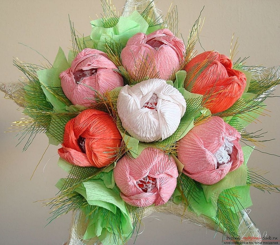 Отличным подарком на любой праздник будут цветы из гофрированной бумаги с шоколадными конфетами внутри. Для создания подобного шедевра потребуются: