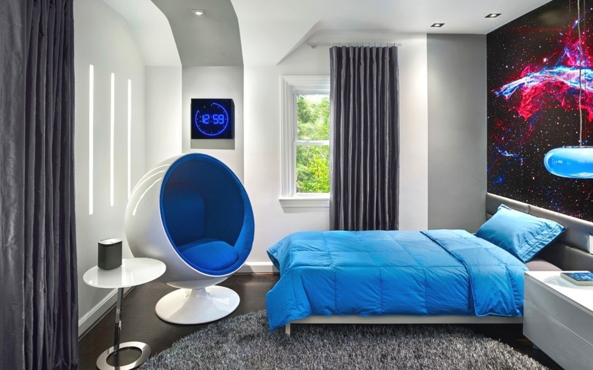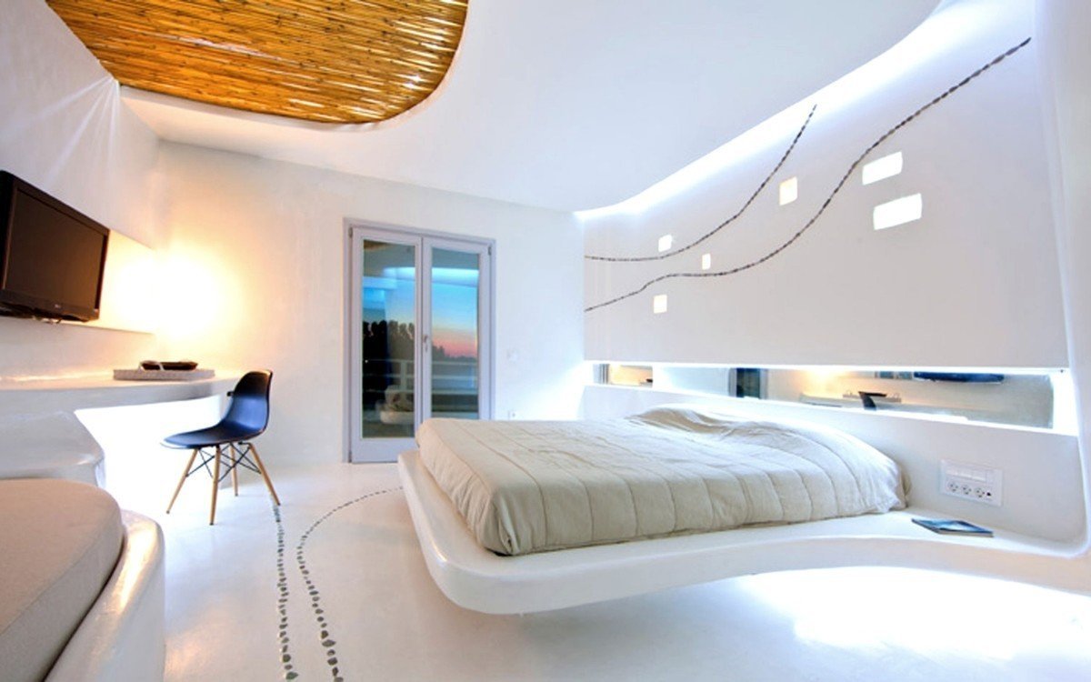 В этом интерьере много пространства, кровать, на которую можно положить матрас подходящей высоты, подушки разного размера и плотности. А центром футуристического дизайна стали стены с необычным рисунком.