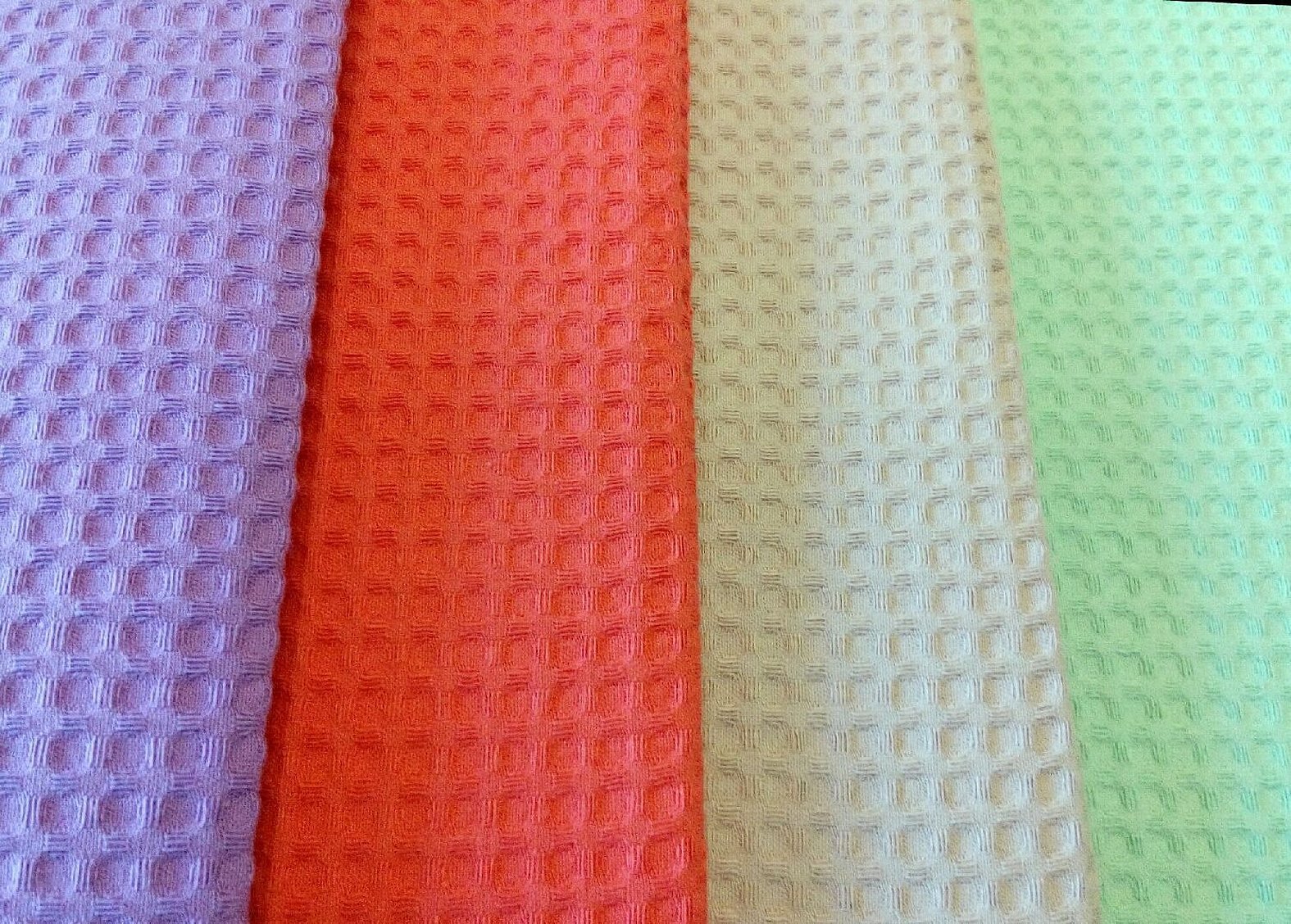 Вафельное полотно почти всегда производится из хлопка. За счет фактуры, которая создается при производстве, изделия из «вафли» очень хорошо впитывают влагу. Еще такая ткань очень полезна при уборке, т.к. качественно впитывает грязь. За счет рифленой структуры можно даже делать массаж. Плотность полотна варьируется от 80 до 240 г/кв.м, чем выше плотность, тем выше качество и, соответственно, стоимость.