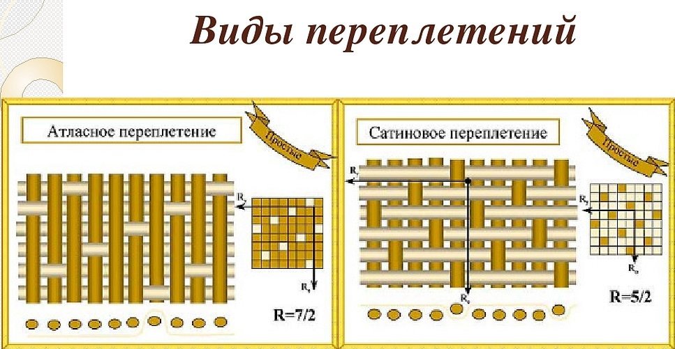 Бывают следующие схемы перекрытия нитей (основа/уток):