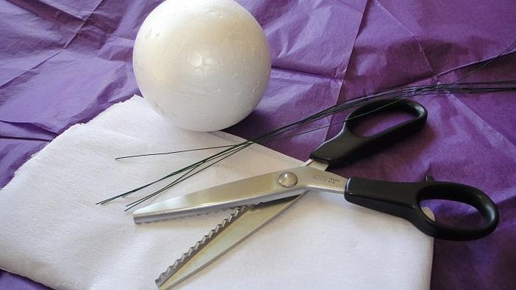 Для начала необходимо подготовить основу. Основой является шарик, на который будут приклеиваться заготовки из ватных дисков. Его можно купить, а можно постараться и изготовить самостоятельно. Сделать его можно просто из помятой бумаги в форме шара, но для того, чтобы форма не распадалась, лучше обмотать ее скотчем или же нитками. Также для основы подойдет мячик, который подходит по размеру, или шар, сделанный из папье-маше.