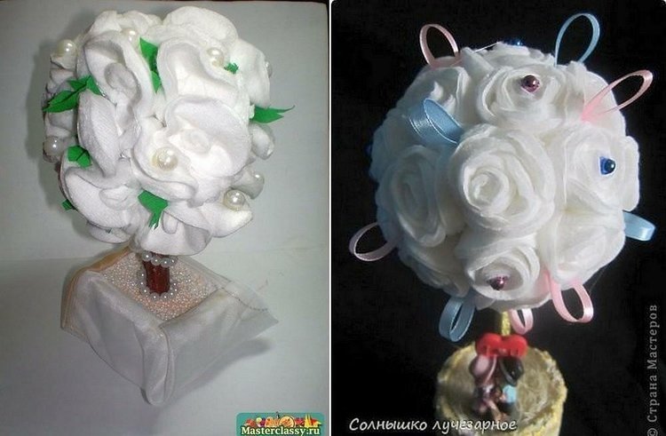 Для изготовления топиария совсем не обязательно скручивать ватные диски в виде розочек. Это могут любые цветы и любые формы.