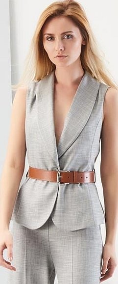Полным женщинам рекомендуется носить пиджак без рукавов с запахом в сочетании с длинными юбками в пол. Этот наряд выглядит очень элегантно и стильно, скрывает особенности телосложения, не перегружая общий лук. Высокое расположение застежки переносит акцент с крупных бедер на зону декольте, а тонкий пояс выгодно подчеркивает талию.