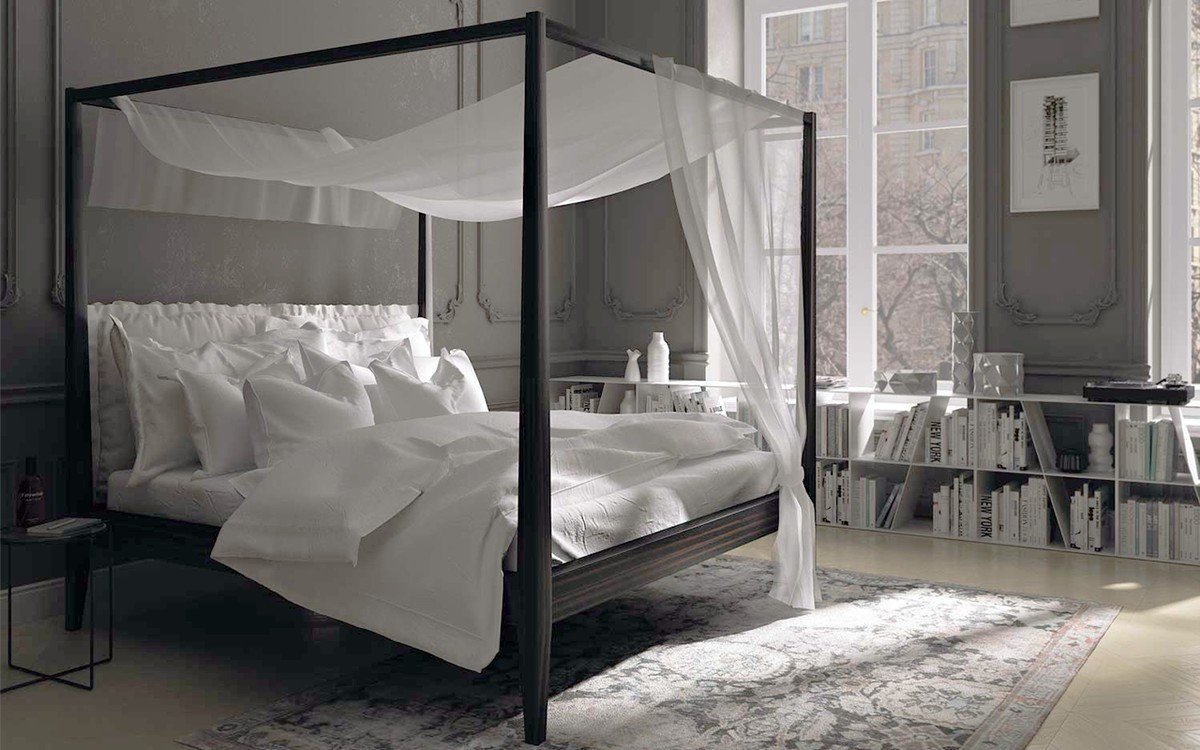 Балдахин – а также шторы, ширма и другие текстильные драпировки для кровати кажутся уже несколько устаревшим, банальным приемом, но поклонники жанра вполне могут его идейно освежить. Как вам балдахин в виде стеклянного куба? Или алюминиевый профиль с жалюзи в стиле хай-тек? Еще тканью можно задекорировать потолок над кроватью или подвесить белоснежный рулон в виде паруса.