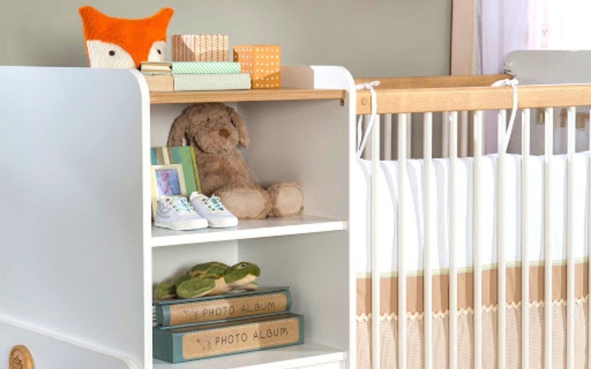 В кроватках для новорожденных тоже могут быть полки или встроенный комод. А еще в них часто предусмотрен пеленальный столик.