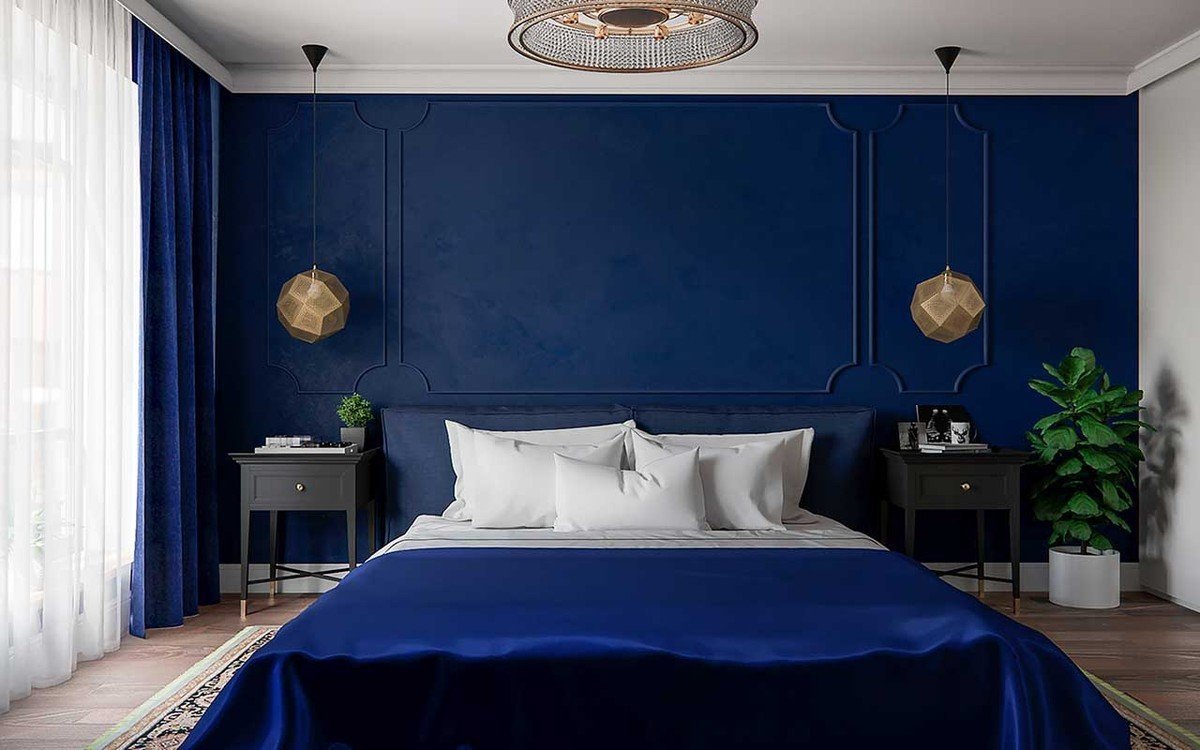 Спальня, смотрящая окнами на север или северо-запад должна оформляться в синих тонах, разбавленных другими цветами.