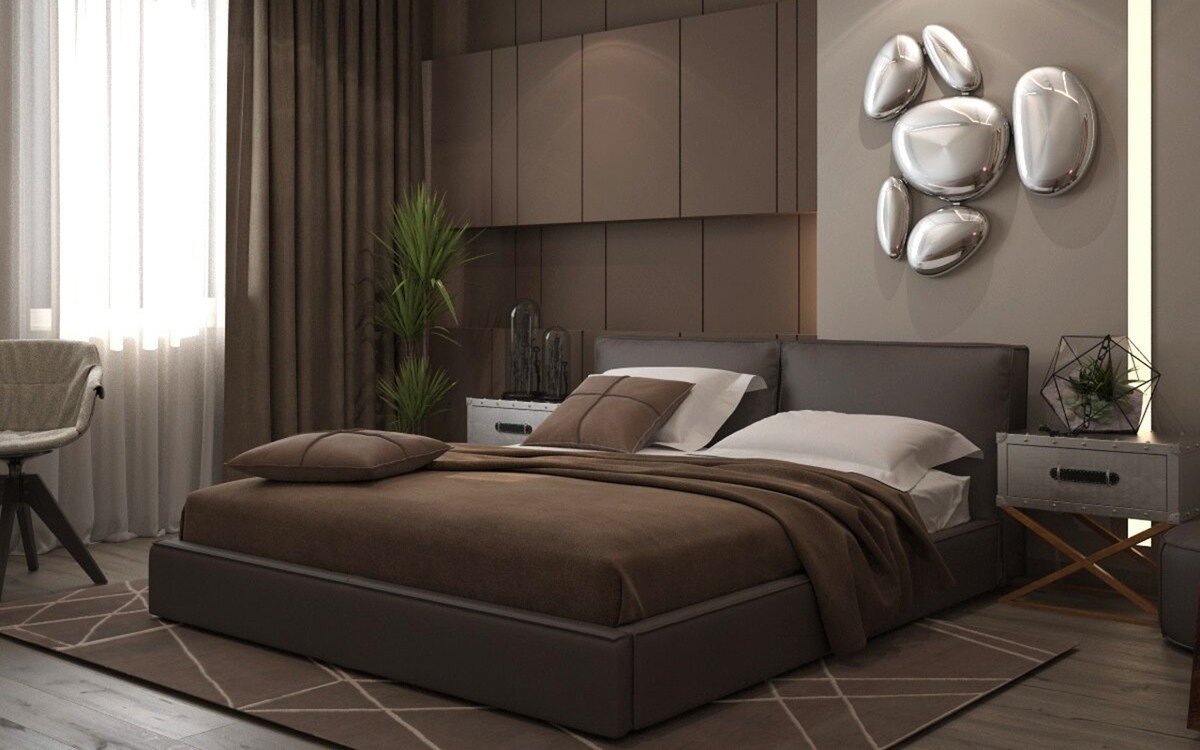 Из окна спальни можно наблюдать заход солнца. Этот ритуал хочется продлить, задержать лучи уходящего светила подольше. Помогут бежевый, песочный, шоколадный цвета, мягкие оттенки коричневого. Присутствие элементов декора, текстиля бронзового и золотистого оттенков продублируют вечерние отблески, внесут дополнительный уют в интерьер.