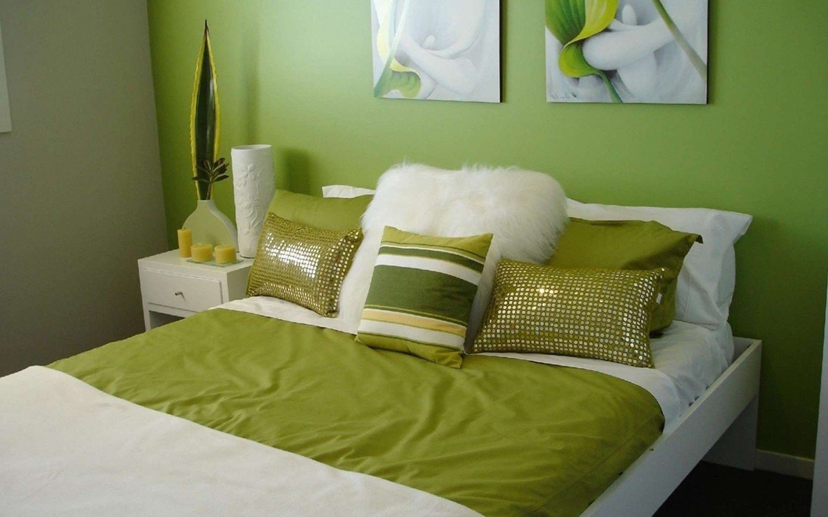В окна спальни, обращенной в сторону восхода, по утрам светит солнце. С его золотыми лучами прекрасно гармонирует зеленый цвет и его оттенки. Удачным решением станут прохладные бирюзовый, сиреневый, серый цвета.