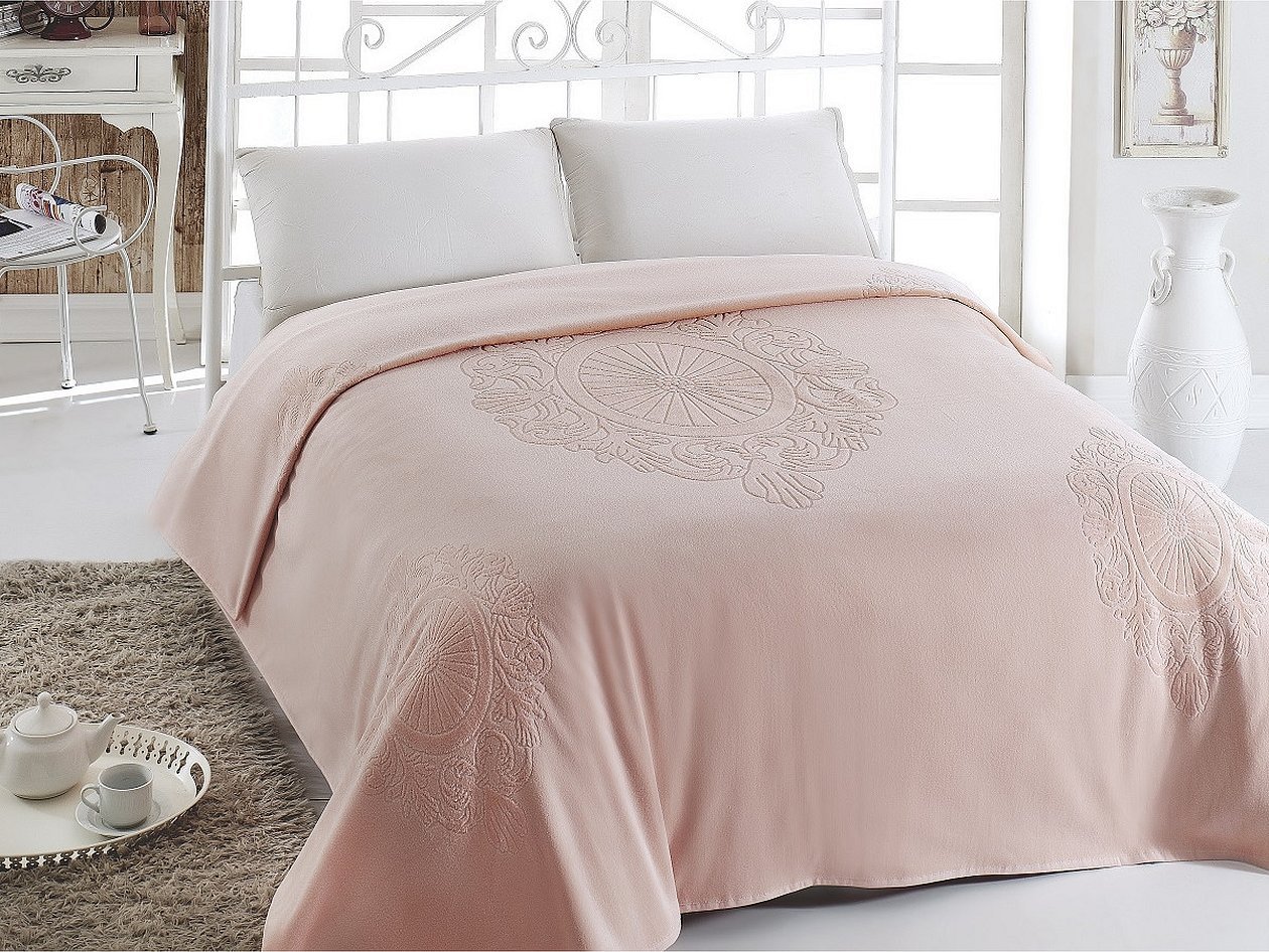 Такой тип покрывал шьется из хлопковой и бамбуковой махровой ткани, обычно к нему добавляют красивый выбитый рисунок. Махровые покрывала отличаются плотностью и долговечностью, а также мягкостью, которая дает возможность людям использовать изделие в качестве пледа или даже легкого летнего одеяла.