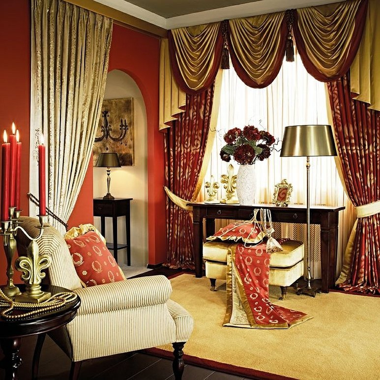 Шторы следует выбирать из атласа или тяжелого шелка.