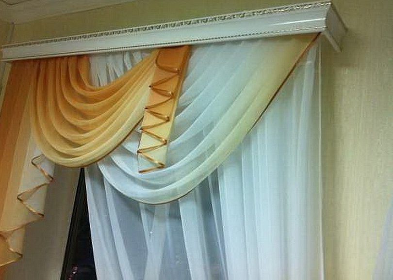 В этом случае красиво будет смотреться стилизованный карниз. Кроме того, можно украсить полотна кисточками.