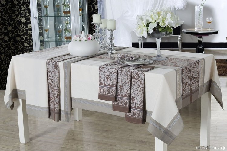 В основном цветовая концепция помогает в украшении нарядных скатертей. Если концепция ограничена максимум двумя цветами, скатерти для праздника обеспечивают тихую и гармоничную общую картину, которая не украдет внимания от самого приема пищи.