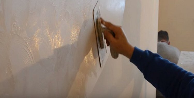 Перед нанесением состава стены нужно выровнять, загрунтовать и зашпаклевать тонким слоем шпаклевки. Ее цвет должен совпадать с цветом финишного покрытия.