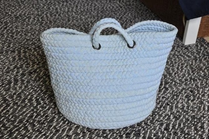 - В готовые отверстия продеваются ручки из тех же косичек. С внутренней стороны они завязываются или сшиваются.