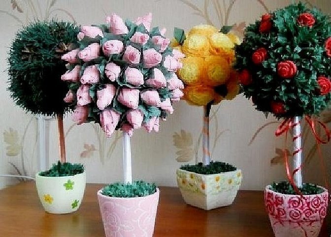 Топиарии из искусственных цветов имеют название «деревья счастья», они украшают интерьер и вносят нотку уюта и современности в дом. Эта европейская традиция плотно прижилась и получила разнообразие — создают деревья не только из кофейных зерен, но и из цветов своими руками, бусин и ленточек.