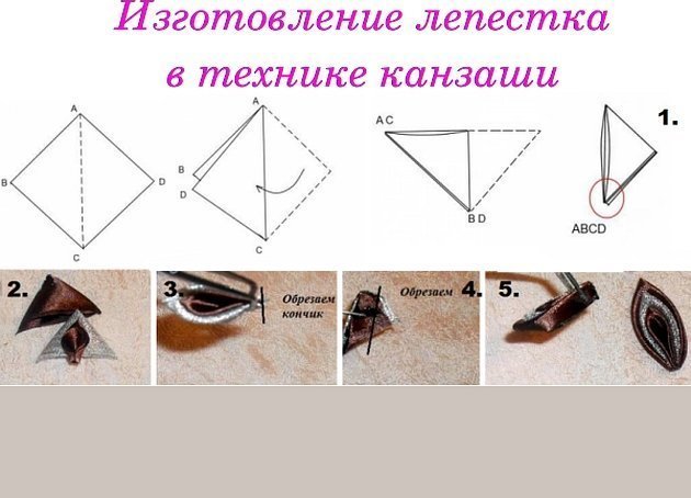 Самым подходящим элементом для диадемы из многочисленных вариантов в стиле канзаши может быть простой или двойной-тройной острый лепесток.