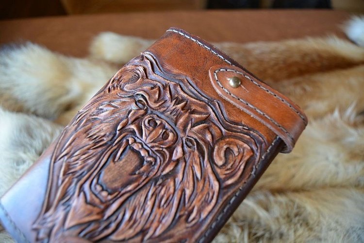 Отрезается длинная тонкая полоска кожи. Этот шнур продевается в отверстия, цветные детали соединяются. Другой полоской нужно «обшить» прямоугольник по контуру. Если полоска кончается, то ее можно нарастить, подклеивая кончик следующей с изнанки обложки. В результате получится совершенно «мужская», брутальная и грубоватая поделка.