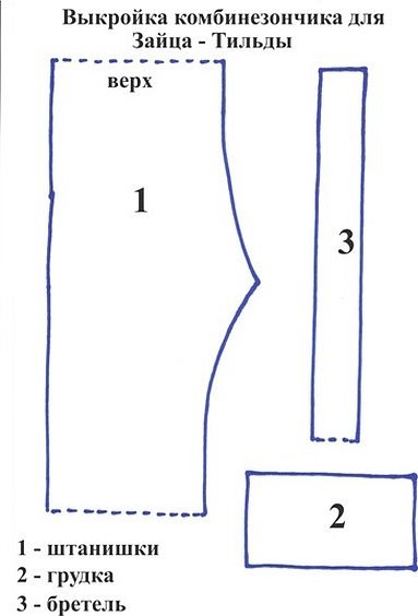 Кроме этого, должна присутствовать хотя бы приблизительная схема для пошива одежды. Вот один из примеров, по которому можно изготовить самый простой комбинезон на бретелях для зайки-мальчика.