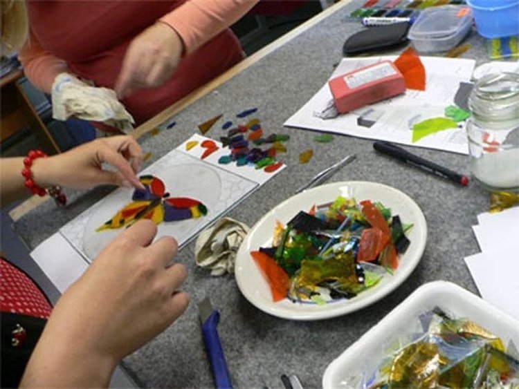 - сборка композиции: кусочки стекла подбирают по форме и цвету, затем выкладывают на основу, формируя нужный узор;
