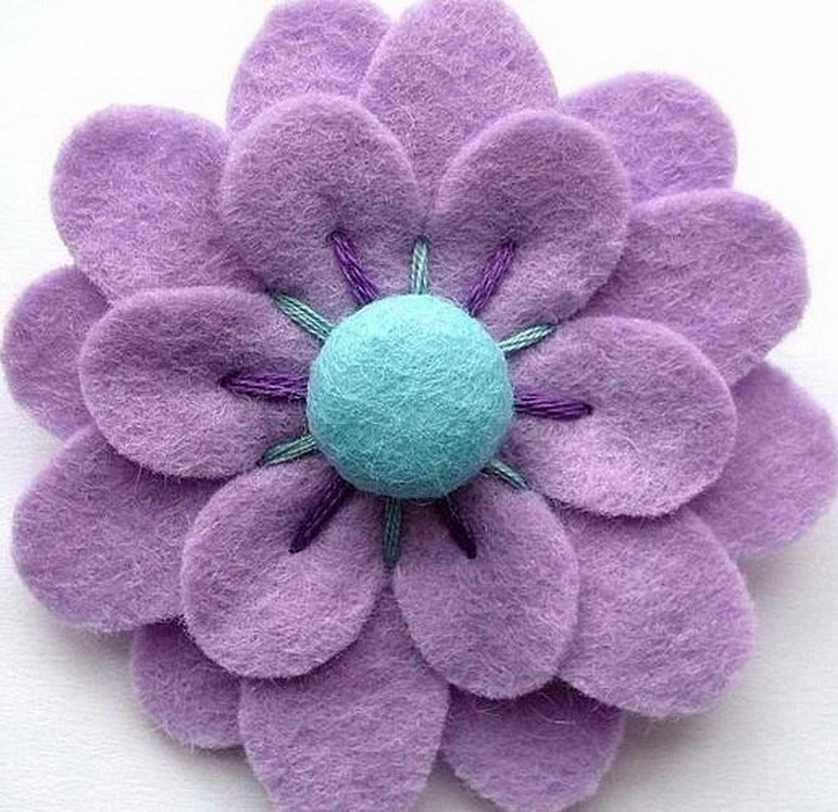 Рассмотрим пример создания цветка из фетровой ткани на примере Георгин. Что потребуется для этой поделки из ткани: фетр, ножницы, клей, цветная пуговица или бусина.
