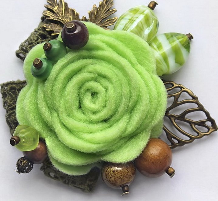 Нижнюю часть рулончика приклеивают к основанию из вырезанных из зеленого фетра листьев и расправляют разгибая в стороны. Получившийся цветок соединяют с основой и булавкой.