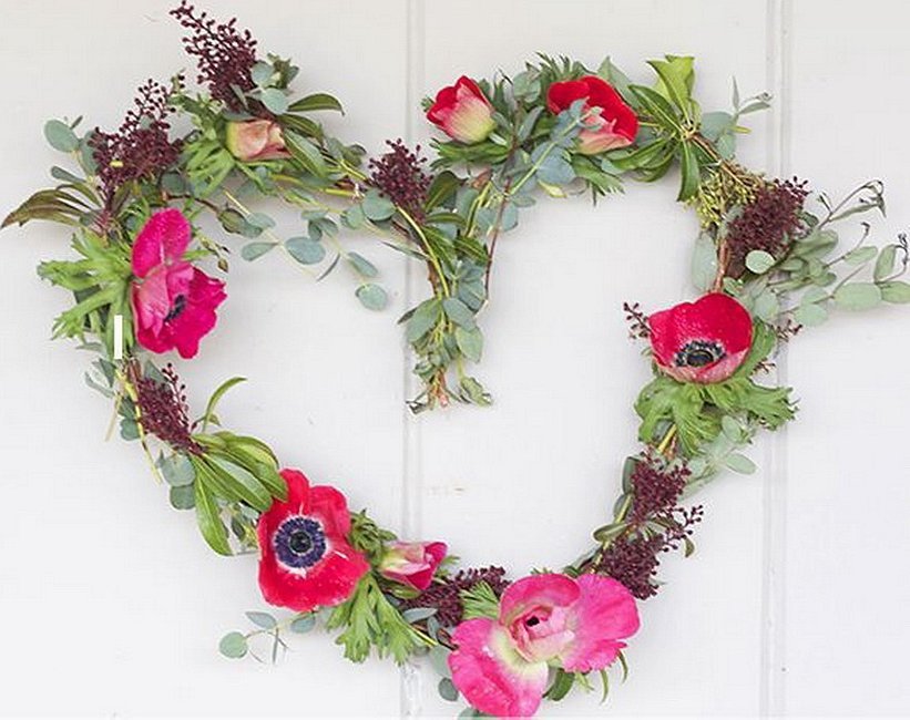 Цветочный венок-сердце. С изготовлением справится даже школьник, а из материалов нужен минимум:цветы, ножницы, картон и клей. Бутоны прикрепляются к вырезанной фигуре сердца и украшаются лентами.