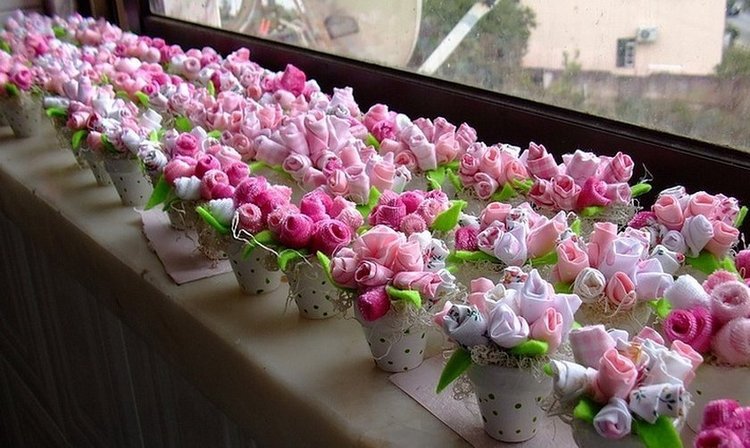 Мини-топиарий. За основу можно взять баночку от детского пюре, на верх приклеить шар из пенопласта подходящего размера. После высыхания клеевого состава шар обклеивается маленькими готовыми искусственными бутонами розу. Сама баночка украшается лентами.