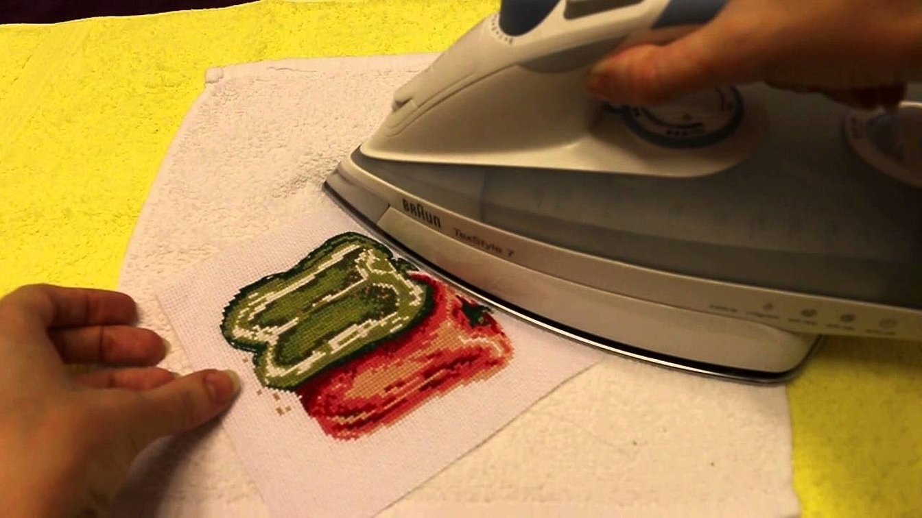 Слегка влажную работу гладят на махровом полотенце со средним ворсом. Так крестики останутся объемными. Режим для утюга лучше выставить для шелковых и деликатных тканей. Гладить нужно с изнаночной стороны. Сильно не надавливая, круговыми движениями. Можно использовать парогенератор и тогда не придется переживать о том, что вышивка испортится.