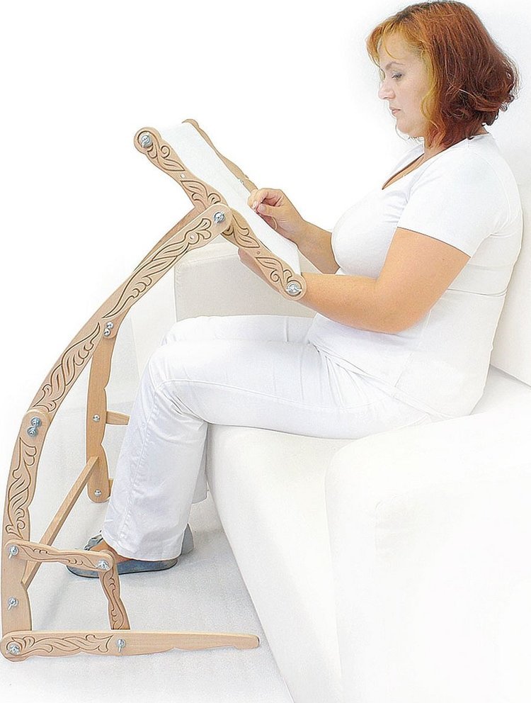 Диванный станок для вышивки. Его используют в случае, когда работать комфортнее всего на диване или кровати. Это дает телу отдыхать, ведь простаивать часами в напряжении за работой может не каждая мастерица. Часто советуют использовать агрегат с имеющимися боковыми держателями, которые позволяют настроить его в точности под параметры фигуры и дивана.
