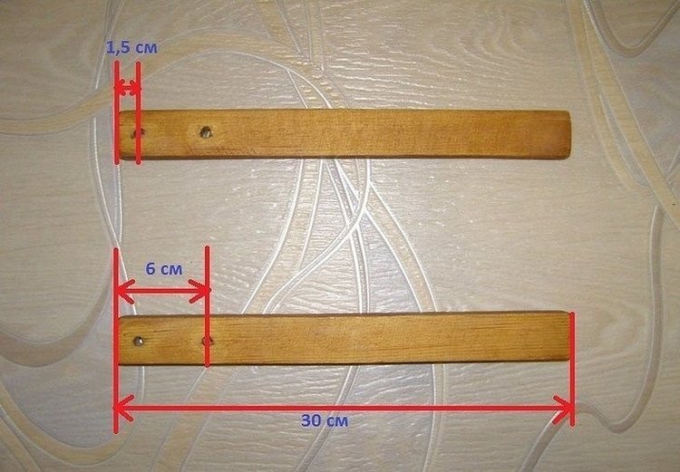 отрезать от рейки 2 детали размером 30 сантиметров и просверлить два отверстия, одно из которых на расстоянии 1,5 сантиметров от края, а другое – 6 сантиметров;