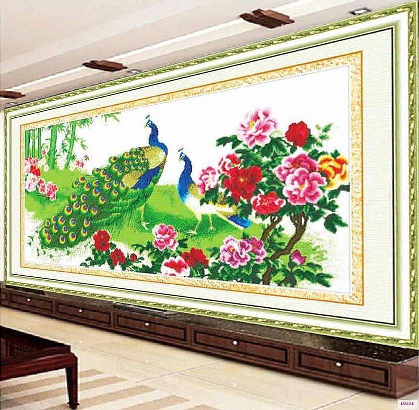 Главная проблема заключается в том, чтобы найти рисунок с готовым ключом распределения цветов мулине по каждой детали. Павлин выполняется более чем в 10 цветов. Для новичков желательно не выполнять картины больших размеров.