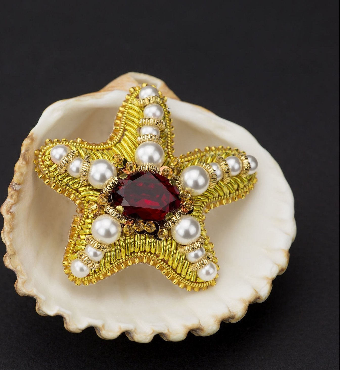 Брошка, выполненная с использованием техника вышивки маленькими кусочками трунцала и отрезками гладкой канители
