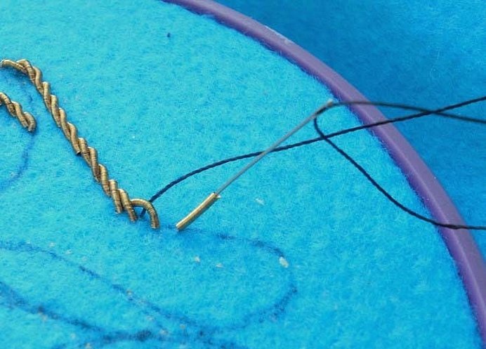 Перед пришиванием длинных отрезков спираль канители немного растягивают, чтобы фиксирующие стежки проходили между витков и были незаметны.