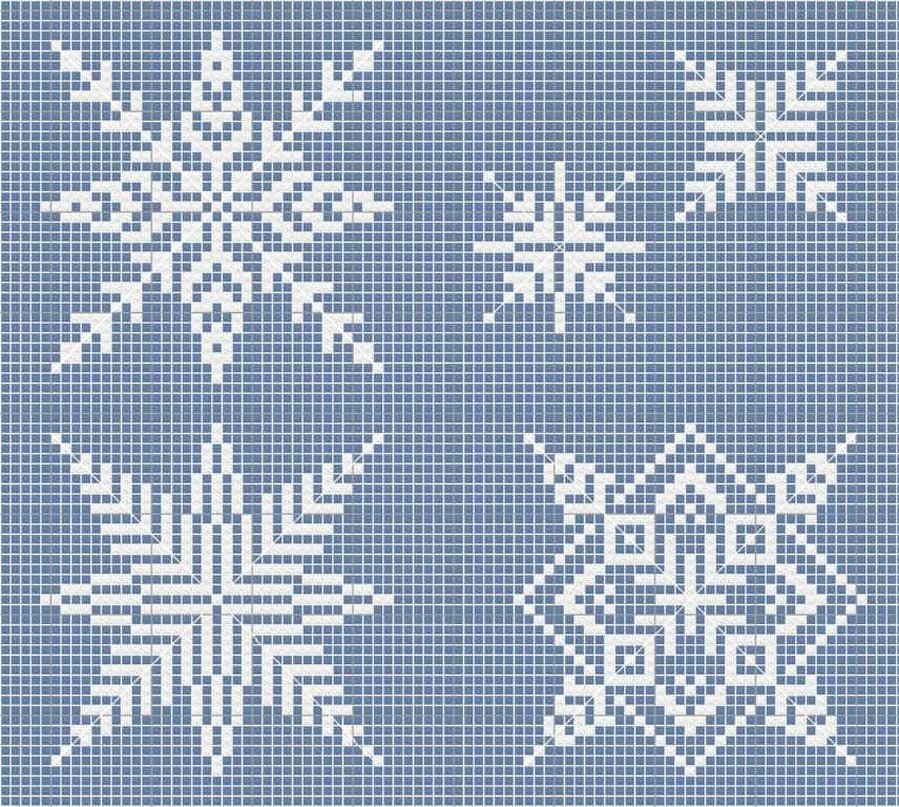Цвет должен отличаться хотя бы на два тона от канвы. Не обязательно делать снежинки белые или голубые. Посчитать, какая длина будет вышиваемого ряда. Далее начать выполнять первые стежки по рисунку, чтобы они все находились в диагональном положении. Далее нужно вернуться назад и начать делать новый ряд по такой же схеме. Таким образом ряд будет выполнен крестиком.