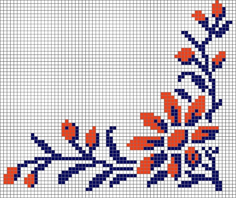 Угловые орнаменты можно выполнять на вафельных полотенцах, подушках или постельном белье. Они достаточно просты в исполнении и занимают не больше часа. Схему можно нарисовать самостоятельно и украсить ее цветами.