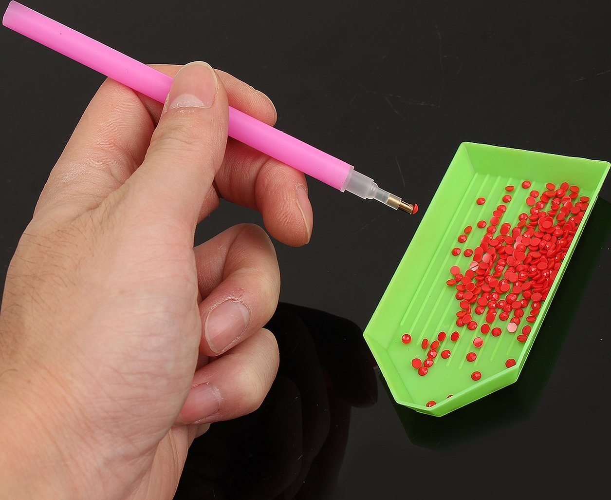 Готовые комплекты с алмазной вышивки всегда дополняются стилусом или пинцетом для выкладывания бусин. Стилус — это специальная пластмассовая палка с острым концом, который опускается в силиконовый гель и прикрепляет камушки на поделку.
