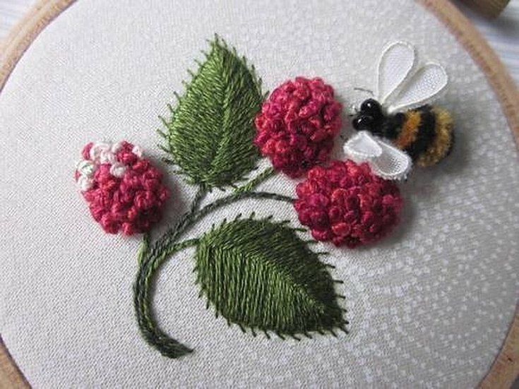 Сделать ягоду фрузелками или целый ягодный куст — отличная идея. Все, что потребуется человеку, это выбрать подходящий рисунок и прошить несколькими слоями узелки. Далее по желанию можно сделать полевые цветы или добавить листьев в технике гладкой вышивки. Затем можно прикрепить насекомых, сделанных своими руками из текстильного материала. Стоит указать, что лучшими ягодами в этой технике будет малина и клубника.