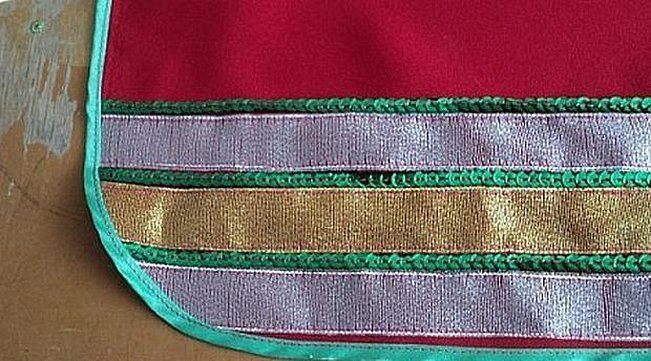 - От середины длины переднюю часть делают закругленной. На задней части параллельно прямому краю делают полосу с украшениями. Уголки можно по своему выбору немного закруглить или оставить прямыми.