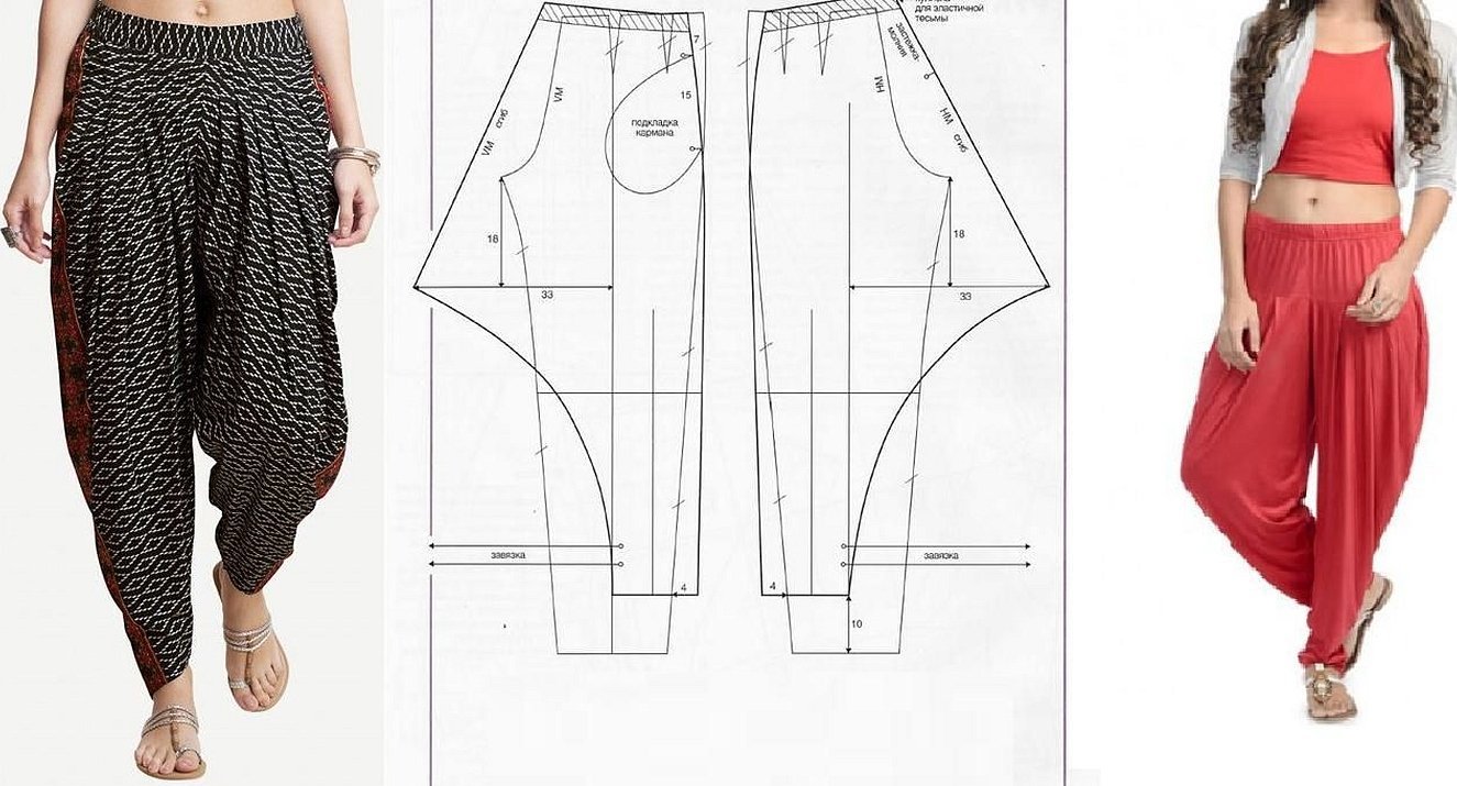 Выкройка для восточных штанов представлена на картинке чуть ниже.