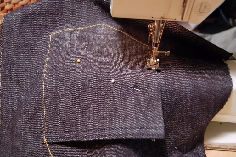 - Зафиксируйте карманы на изделии с помощью булавок и пристрочите.