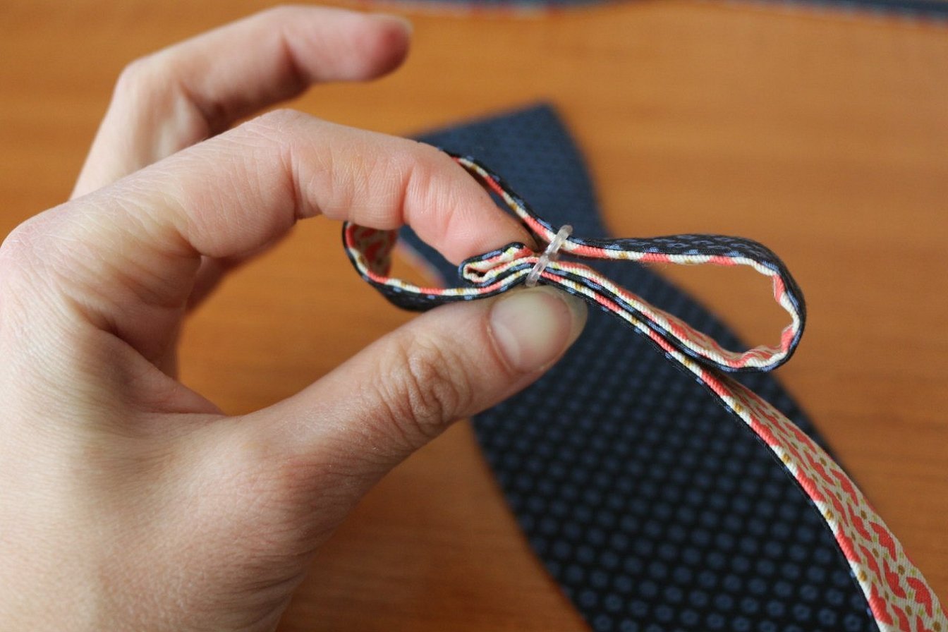 Закрепить на концах завязок застежку с возможностью регулировки длины. Зафиксировать застежку на машинке или вручную.