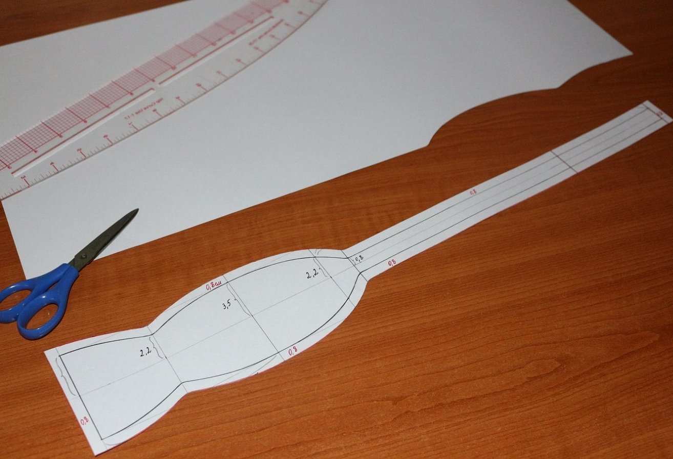 Раскроить 2 детали с короткими завязками, 2 детали – с длинными.