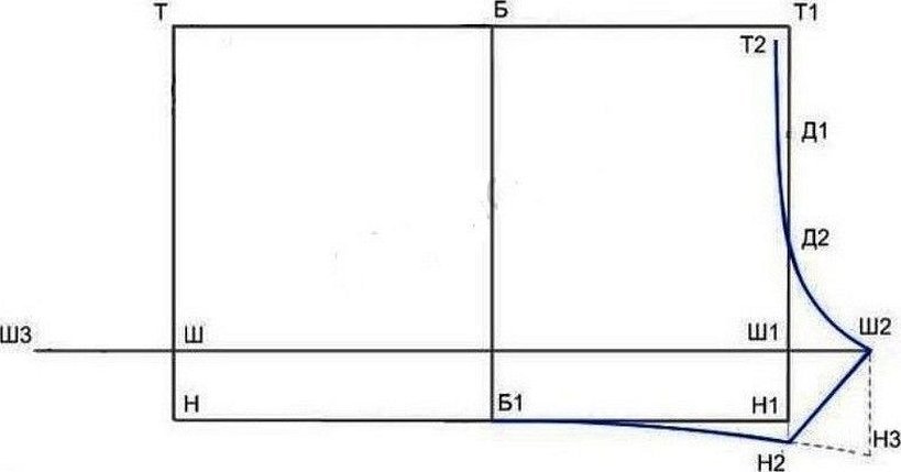 По стороне ТН строится отрезок ТШ, равный половине обхвата бедер (СБ) плюс припуск (ПБ). Через точку Ш прочерчивается луч, параллельный стороне НН1, до пересечения с линией Т1Н1. Точка пересечения отмечается буквой Ш1. От нее вправо откладывается отрезок Ш1Ш2=СБ/8+1 см. Затем от Ш влево чертится отрезок ШШ3=СБ/4-1 см.
