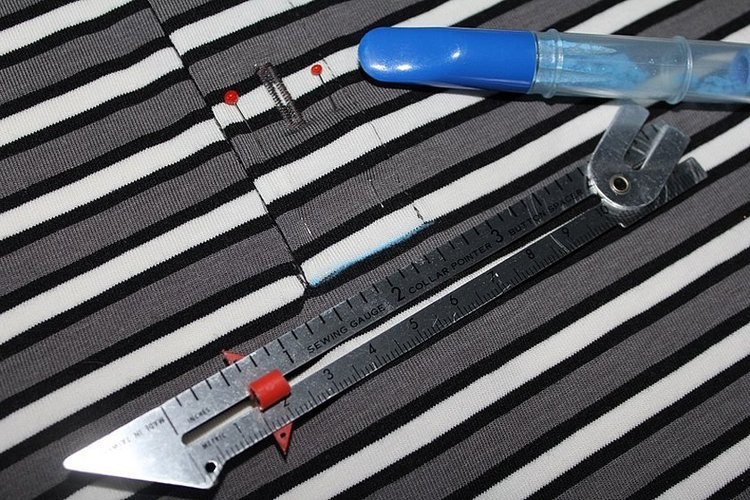 - На изнаночной стороне полочки наметить положение и длину планки: 17 см и половину планки в 1,5 см. Нижний край укрепить флизелином.