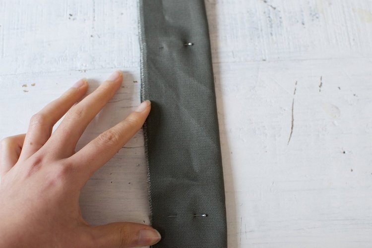 Вырежьте фрагмент для пояса (10-15 см в ширину), сложите пополам и зафиксируйте булавками.