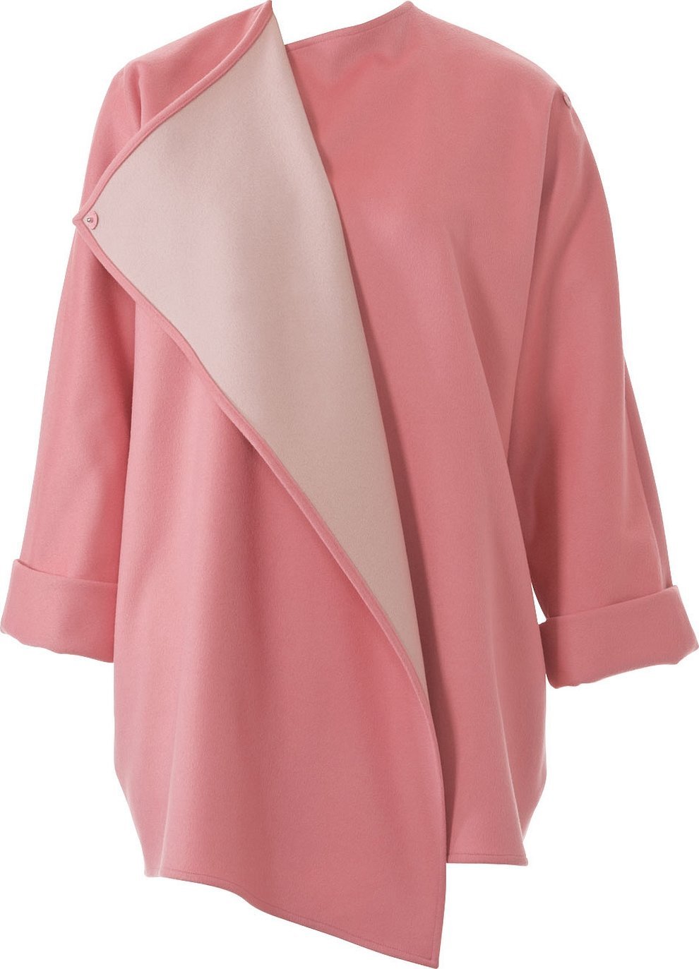 Широкий, удлиненный жакет без воротника с рукавами типа «кимоно» и пройменными вставками застегивается на две кнопки. При этом один из фрагментов полочки превращается в лацкан, совмещенный с горловиной или лежащий в качестве запаха.