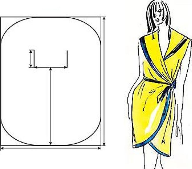 Размеры должны быть следующими. По длине этот цельный отрез должен превосходить рост женщины. По ширине требуется, чтобы ткань можно было бы обернуть вокруг тела с запахом.
