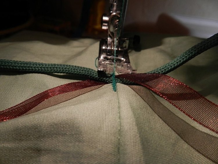 К одному из боковых швов на расстоянии 3-4 см от края пришить ленту или шнур. Отмерить длину будущей завязки, сложить пополам и в точке сгиба с помощью нескольких стежков произвести крепление элемента. С помощью утяжки вершины мешка производится завязывание прикрепленного элемента.
